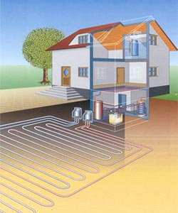 In ca. 1m Tiefe werden Rohre im Boden verlegt. Durch die Rohre strömt eine ungiftige Flüssigkeit, welche die Energie zur Wärmepumpe transportiert. Für ein Haus mit einer Wohnfläche von ca. 150 qm benötigt man ungefähr 180qm Verlegefläche auf dem Grundstück. |