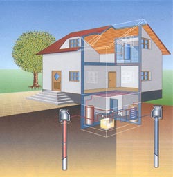 Beim Energiegewinn aus dem Grundwasser werden 2 Brunnen benötigt. Aus dem Saugbrunnen wird das Grundwasser entnommen. Die im Wasser enthaltene Energie wird von der Wärmepumpe genutzt. In den Schluckbrunnen wird das Wasser zurückgeführt. Insbesondere bei sehr großem Heizbedarf kann diese Lösung interessant sein, da bei entsprechenden Bedingungen mit geringem Aufwand die Wärmequelle Grundwasser zur Verfügung steht. |