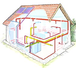 Die Luft-Wasser-Wärmepumpe kann zusätzlich mit einer Wohnungslüftung kombiniert werden. Für neue, luftdicht gebaute Häuser bietet diese Technik einen hohen Wohnkomfort, gepaart mit höchster Effizienz. Die kontrollierte Wohnungslüftung verringert erheblich den Wärmebedarf des Hauses. In Kombination mit der Wärmepumpe entsteht eine Lösung, welche den Jahresprimärenergiebedarf des Wohnhauses um ca. 50% senkt. |